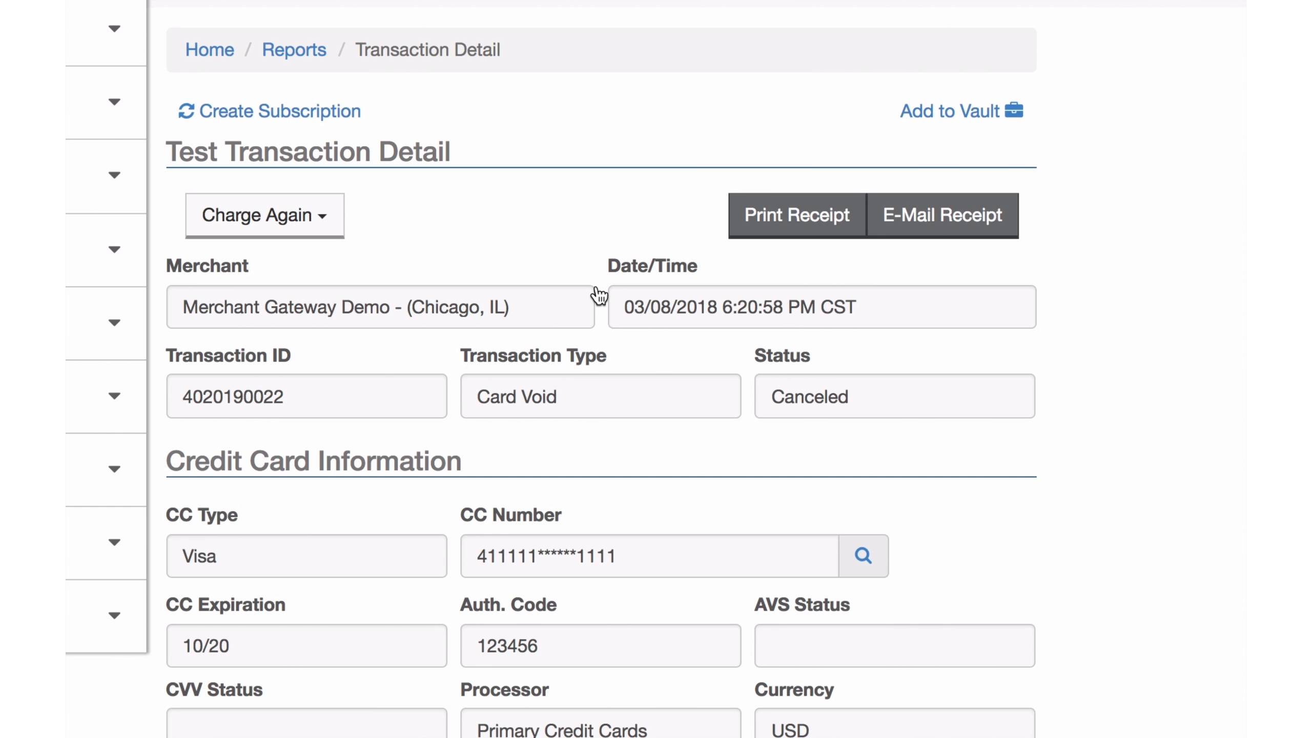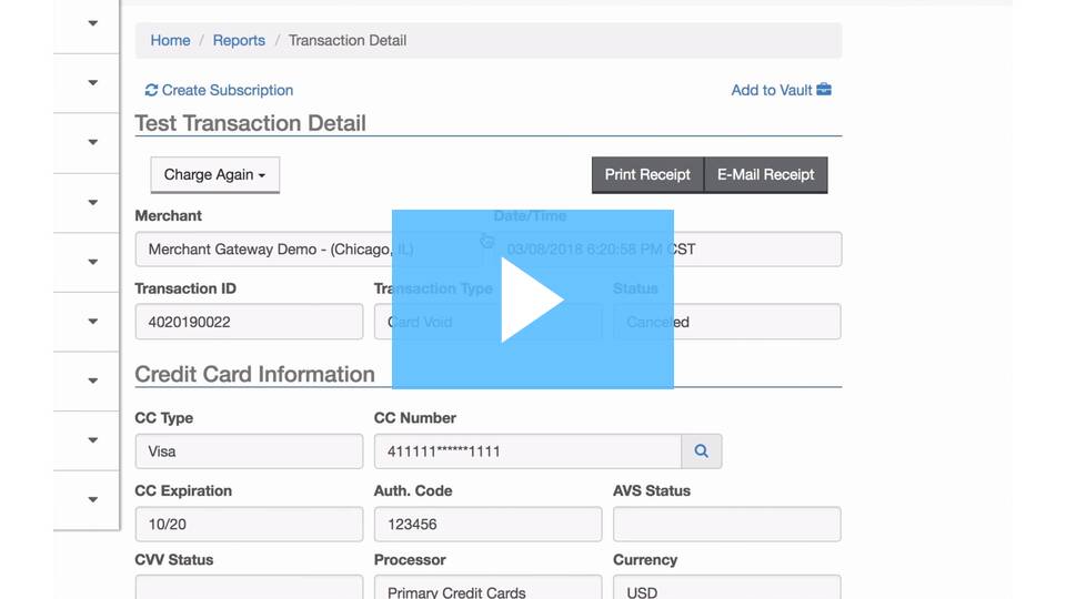 Step 7: Alternately, if you already know the Transaction ID number, simply click ‘Void’’ from the ‘Main Menu’ under ‘Credit Card’.